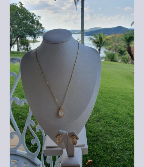 Apresentamos nosso conjunto de colar e brincos gota com pedra quartzo rosa.Ideal para compor qualquer look seja no dia a dia ou as ocasiçoes especiais. Transforme seu look com elegância e sofisticação com este conjunto pedra quartzo rosa.